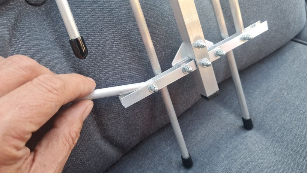 De boom heb ik gemaakt van 15mm vierkant profiel en de elementen van 6mm pijp, om de elementen te laten scharnieren heb ik een U-profiel gebruikt van 8mm de binnenmaat van het U-profiel is 6mm dus de elementen passen daar mooi tussen. Alles werd vast gezet met M3 boutjes en moertjes. Later heb ik bij de bevestiging van de U-profielen aan de boom nog schetsplaatjes bij geplaatst om een steviger verbinding te krijgen. De totale omtrek van de hairpin match bedraagt 11,5cm gemeten van de ene tot de andere kant.