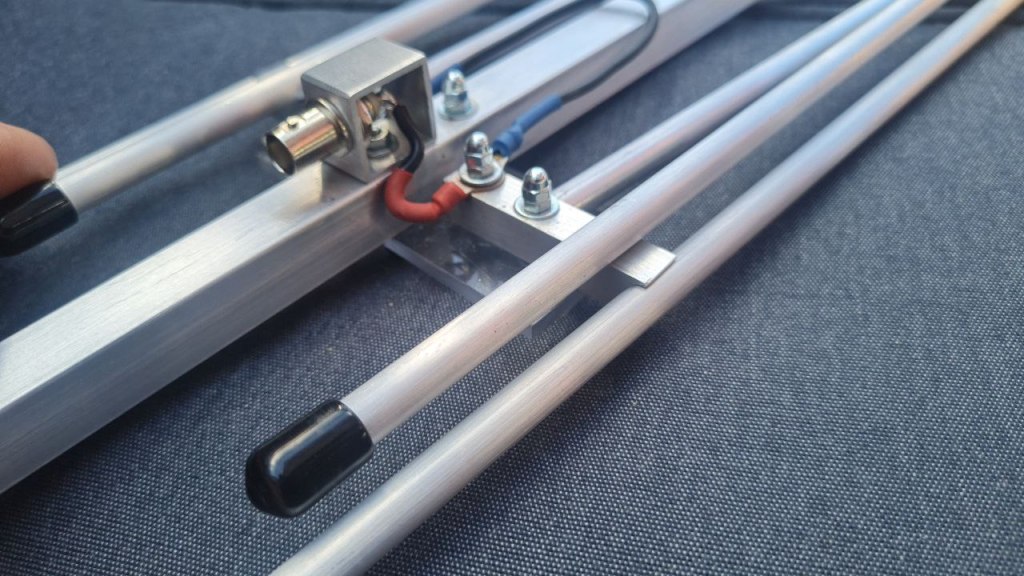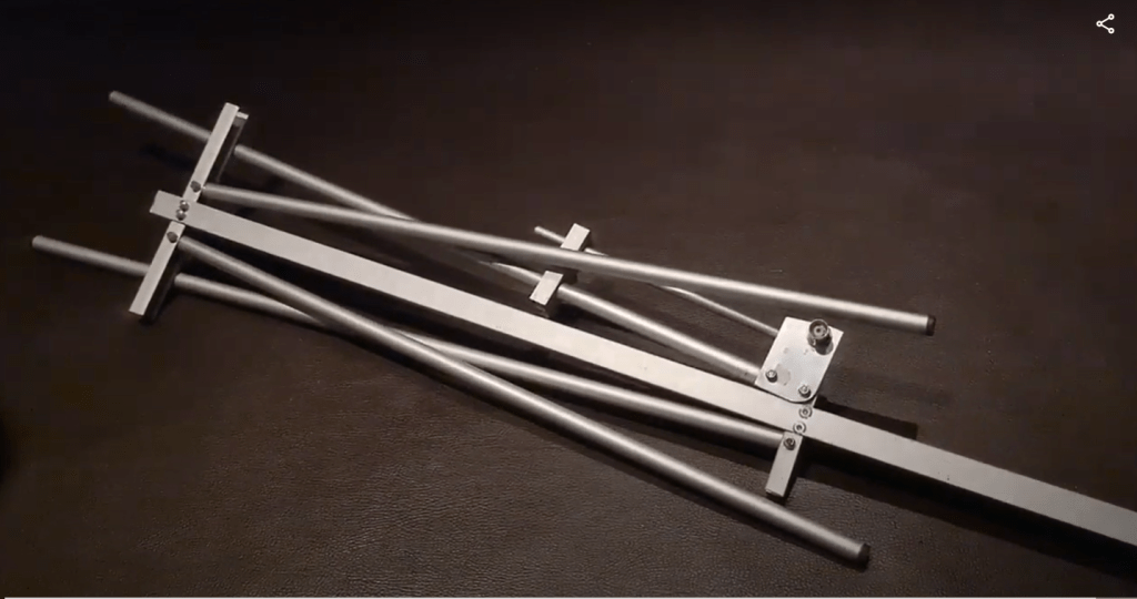 Toen ik voor het eerst aan die vossenjacht in Gorinchem had mee gedaan was ik verkocht, erg leuk om te doen, maar die antenne in en uit de auto was zoals eerder gezegd een ramp!! Dus ik wilde iets maken wat net zo goed zou werken maar snel inzetbaar is. Ik zat eerst aan een paraplu systeem te denken, maar dat was nog niet zo eenvoudig. Toen kwam ik op dit idee, de RDF 2 meter 10 seconden uitklap yagi. Het eerst prototype wat ik gemaakt had was van rest afval aluminium 10mm elementen met een gamma match die moest natuurlijk ook mee moest bewegen bij het in en uitvouwen. Het idee werkte wel maar de antenne bleek veel te zwaar. Dus op naar versie 2, dunner aluminium, 6mm buis voor de elementen en om een goede scharnier constructie te kunnen maken geen gamma match maar een hairpin match gebruiken.