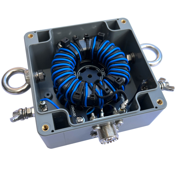 Mogelijk ziet u online voorbeelden waarbij een 4:1-  stroombalun is gebouwd op een enkele ferrietkern – dit is onjuist!   Om de balun effectief te laten werken, MOET deze op 2 afzonderlijke toroïden worden gewikkeld. Een ander voordeel is dat u dikkere draad kunt gebruiken voor een grotere stroomcapaciteit. De kabel hier is een 15A auto/luidspreker-twin. Als je eisen iets meer “QRP” zijn, dan kun je een lichtere versie opwinden op 2x FT140-43 toroïden – zeker goed voor maximaal 100w. Je kunt de ferrieten uiteraard op elkaar leggen zodat ze in de doos passen als het gaat om het afwerken van het project.