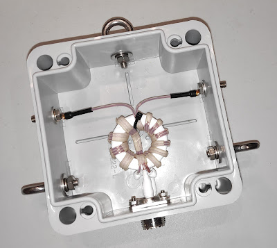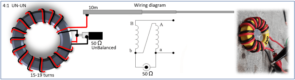 Degenen onder u met scherpe ogen zullen deze Balun ook herkennen als vergelijkbaar met de balun die wordt gebruikt in de G3TXQ CobWeb. In die situatie is de Balun echter op de tegenovergestelde manier aangesloten: de antenneaansluitingen zijn verbonden met het parallelle paar draden en het voedingspunt met het seriepaar. Dit verandert het in een 1:4 Balun, waardoor het eindresultaat 4x is, wat er ook in gaat. In het geval van het CobWeb is 12,5*4=50. Geen ingewikkelde formule hier, alleen basiswiskunde en een beetje gezond verstand.