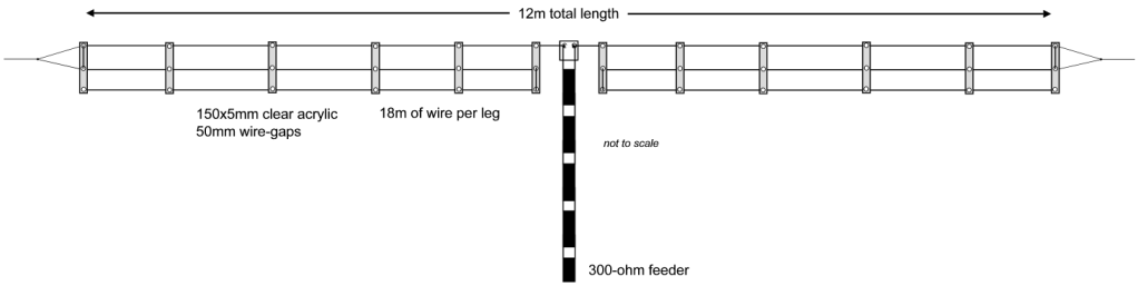 Als je overweegt een Doublet op te zetten, dan is een eenvoudige 1:1 Balun/Choke op de ladderlijn/coax-verbinding prima. Als je interesse ligt in de lagere (<10MHz) banden, zal het toevoegen van meer draad aan de antenne door ze op een set plastic spreiders te kronkelen ook goed werken. Hieronder ziet u een diagram van een 80m Doublet die ik gebruikte bij mijn oude QTH. In een tuin van 12 meter slaagde ik erin om iets minder dan 18 meter draad aan elke kant van de feeder te krijgen door gebruik te maken van een aantal doorzichtige plastic spreiders. De draad ‘kronkelt’ er eenvoudig doorheen: vanuit het midden naar buiten, terug naar binnen en dan naar buiten naar de uiteinde. Het is een geweldige manier om een ​​geluidsarme en gebalanceerde antenne in de lucht te krijgen als uw tuin niet bijzonder groot is.