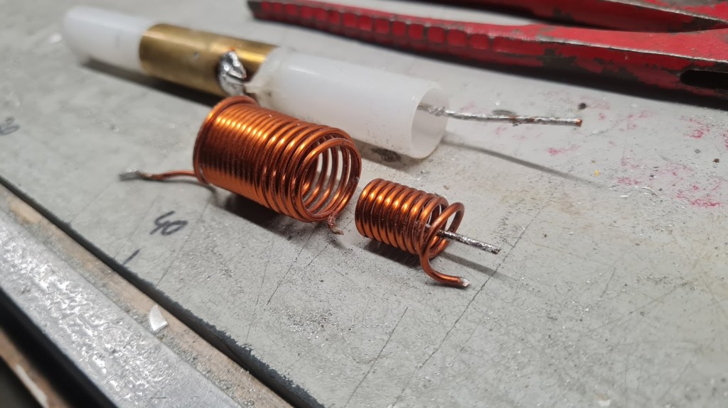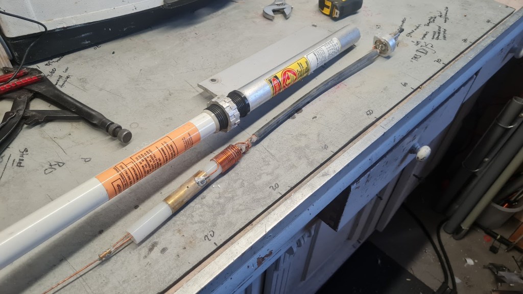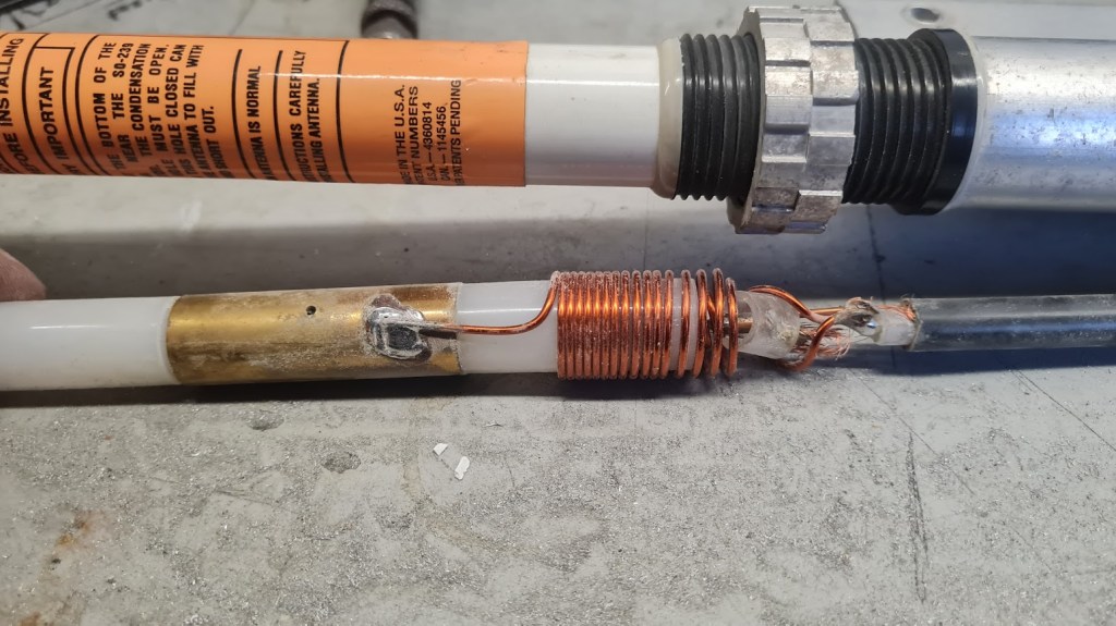 hier een beeld van hoe de binnenste impedantie-aanpassingsspoel in de buitenste afstemspoel past. Omdat de radiatorlengte .64 golven bedraagt, is de impedantie op dit punt extreem hoog. De binnenste spoel zorgt voor een aftakking van 50 ohm op het aangedreven element, terwijl de buitenste spoel de capacitieve reactantie opheft die wordt gecreëerd door de koppelcondensator en de capaciteit aan het gevoede uiteinde van de radiator.