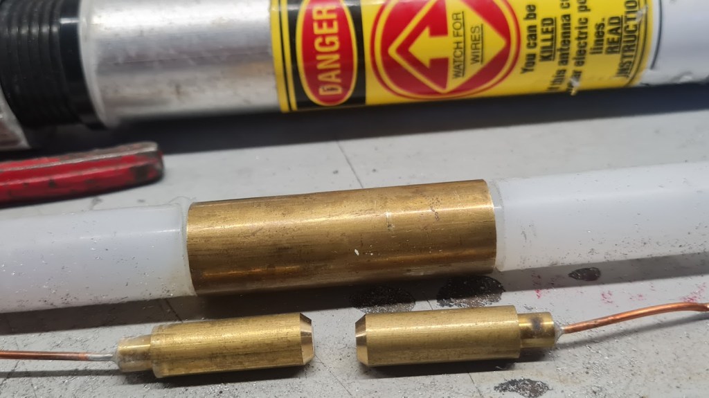 Condensatorkoppeleenheid met de componenten naast elkaar ter referentie van de afstand. Een koperen cilinder in het nylon vormt de binnengeleider of ‘plaat’ van elk uiteinde van de koppelcondensator. De koperen cilinders raken elkaar niet van begin tot eind, er is een kleine ruimte over die bij blikseminslag als een vonkbrug fungeert om de lading rechtstreeks naar de aarde te brengen.