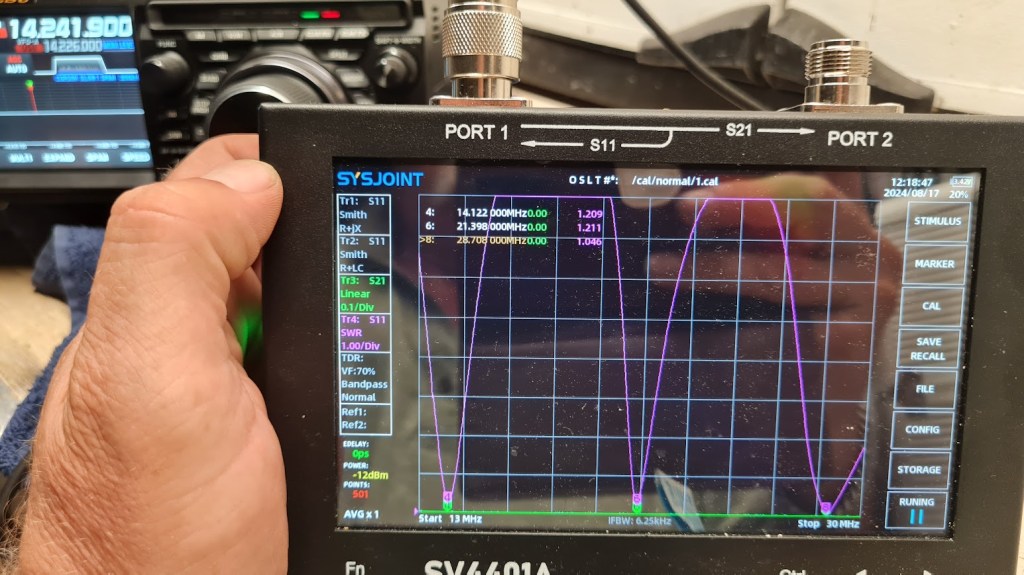 Op 20m een dip rond de 14.122 en SWR 1:1.5 over een bandbreedte van 300 MHz van 14.050 – 14.350.
