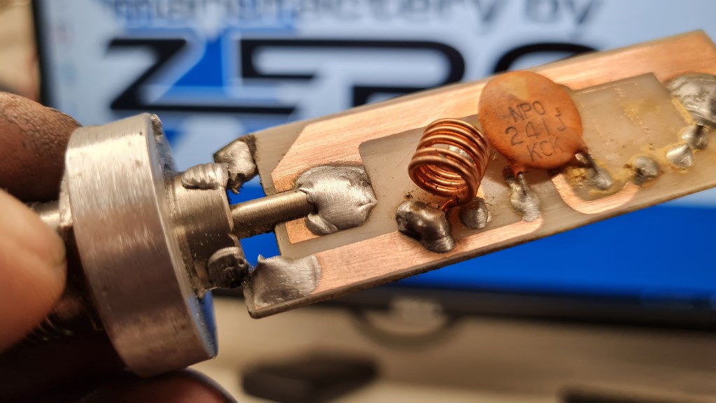 Na demontage ging de antenne op de werkbank. Mijn eerste vermoeden was een probleem bij de antenneaansluiting. Onderaan de CP-6 bevindt zich een aanpassingsnetwerk dat tevens dient voor het afvoeren van statische lading. Bij het doormeten van deze print bleek dat er iets niet klopte.