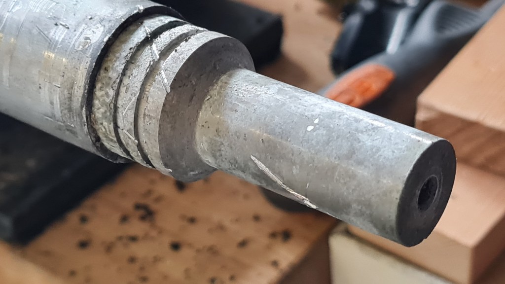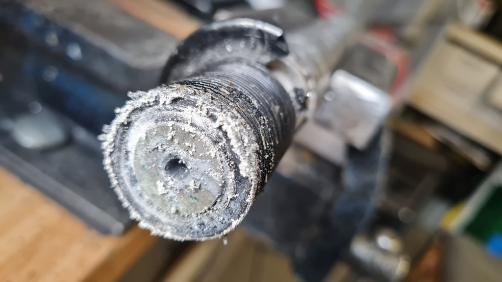 Deze verbinding had elektrisch één geheel moeten vormen, met een zeer lage overgangsweerstand (praktisch 0,002 ohm). In de praktijk werd echter een oneindige weerstand gemeten. Hoewel de aluminium pen mechanisch stevig in het verticale element zat en niet te demonteren was, bleek er elektrisch geen continuïteit aanwezig. De oorzaak was aluminiumoxidatie tussen de contactvlakken, waardoor de overgang volledig isolerend was geworden. De oorzaak: oxidatie tussen de onderdelen, waardoor er geen elektrisch contact meer was. Ik heb een gat geboord en een schroef geplaatst om een betrouwbare elektrische verbinding te realiseren.
