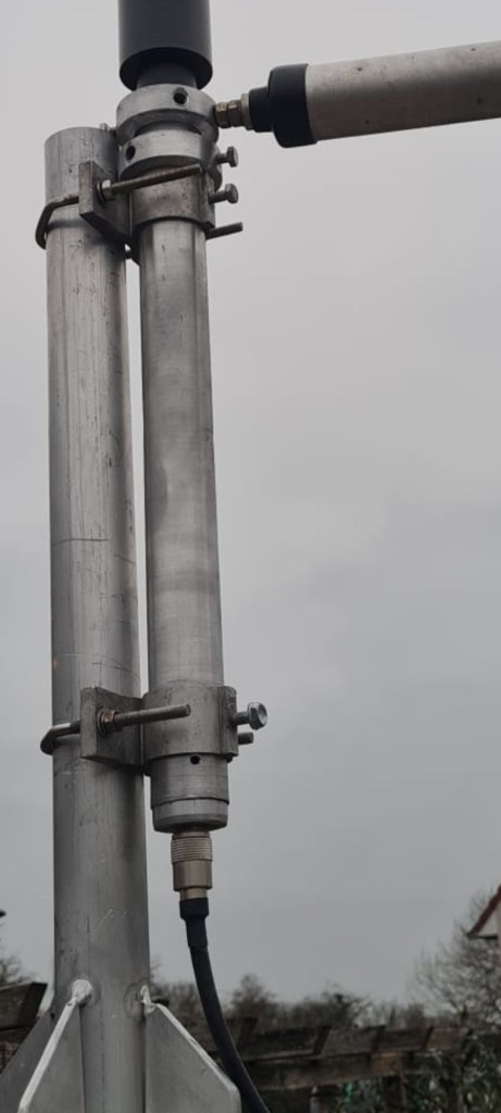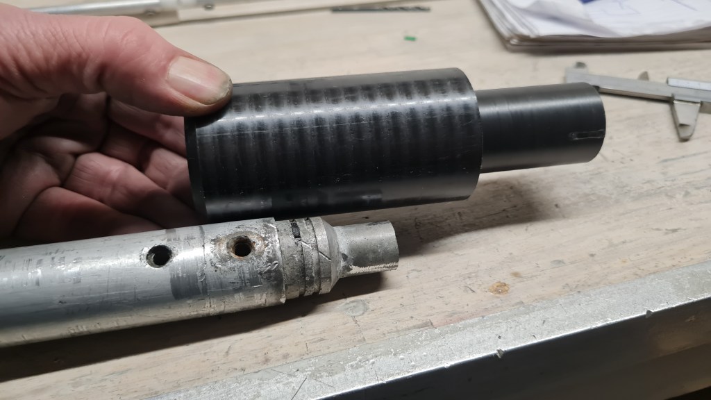 Normaal gesproken wordt de CP-6 gemonteerd in een aluminium deel van de tegencapaciteit. Dit pijpje heb ik weggelaten en de radiaal en tegencapaciteit via een stuk POM met elkaar verbonden. De print werd in de onderste buis geplaatst en helemaal onderin kwam een massieve aluminium dop met plug.