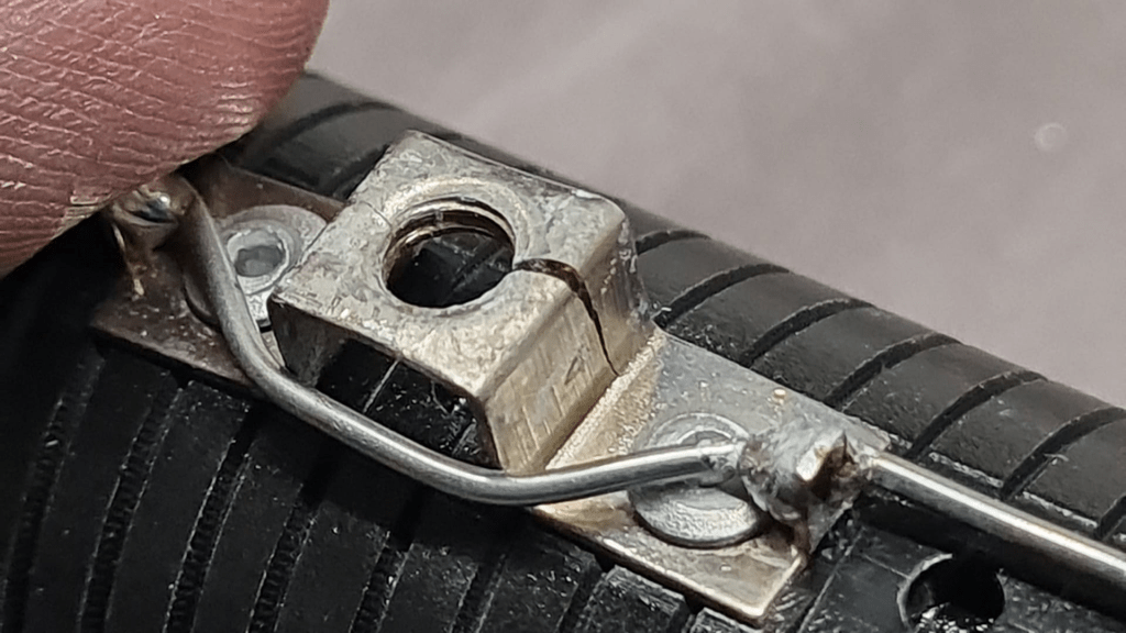 Mijn oplossing was om onder de clip/beugel een koperen moer te solderen. Deze constructie kan meer trekkracht aan dan een dunne beugel van circa 1 mm dik. Na behandeling met geleidende pasta en bescherming tegen vocht en condens werd de trap weer gesloten.