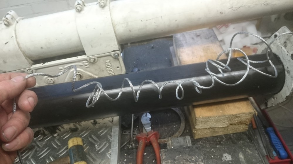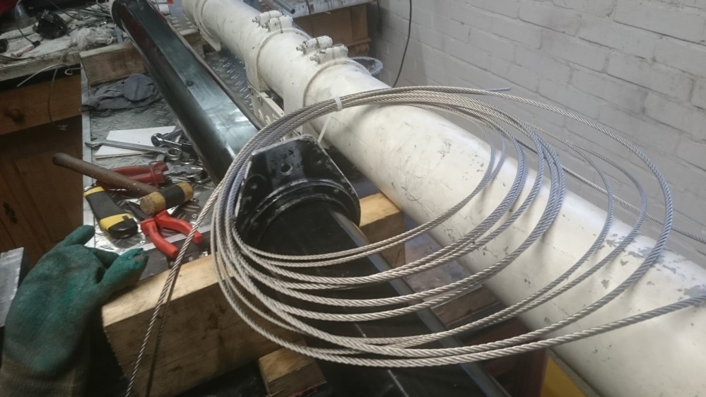 Ik ben naar de watersportwinkel gegaan voor verse 7×19 RVS staalkabel. Om te voorkomen dat de kabel weer los zou schieten, heb ik deze keer degelijke draadklemmen gebruikt op de vaste punten.